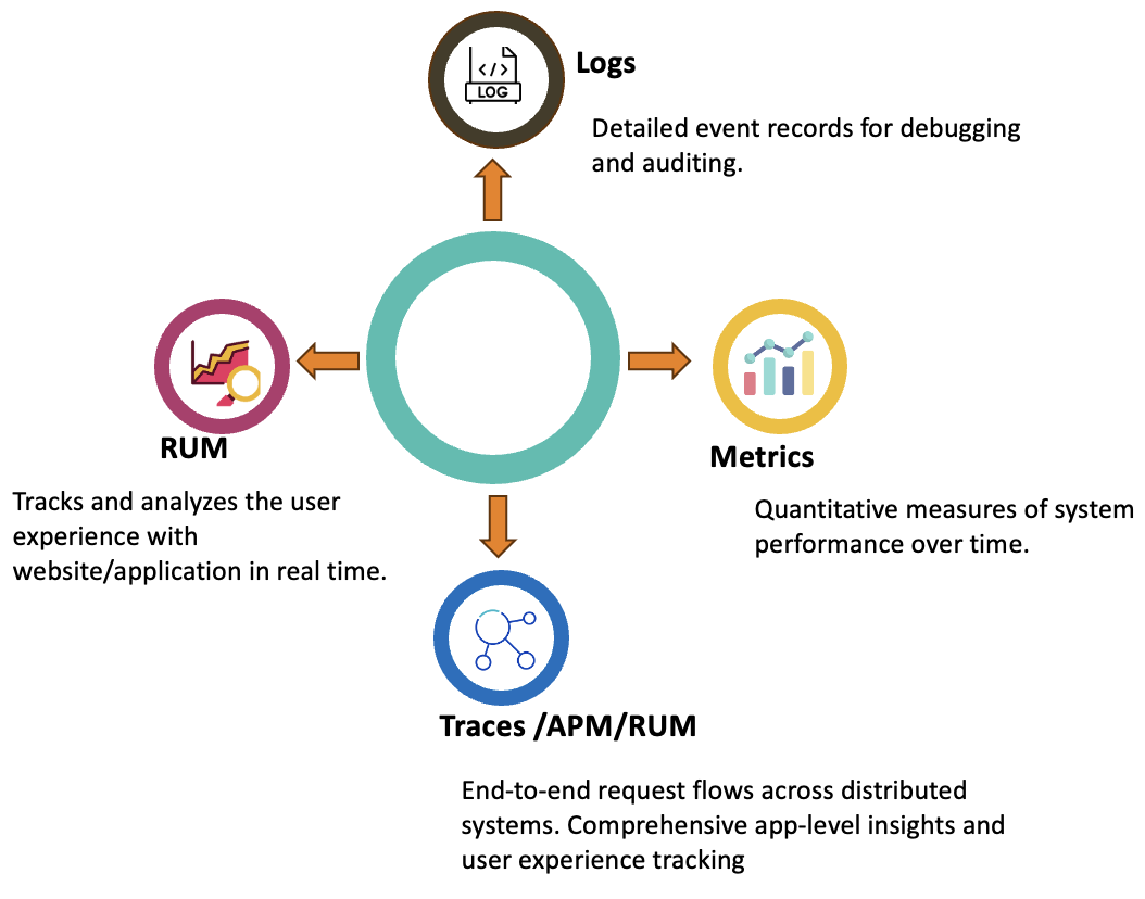 - RUM:Realtime User Experience - tracks and analyzes the behavior and experiences of users interacting with a website or application in real time. Tracks user journey tracking, performance metrics, geographical, browser and device level analysis.